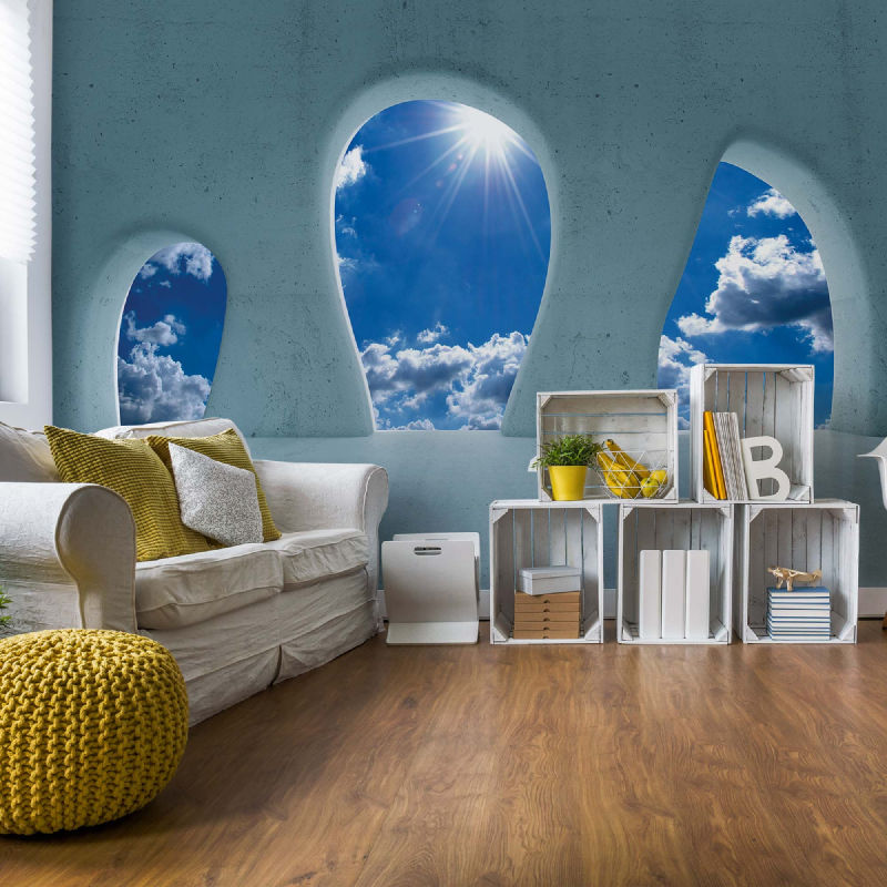 Ge ditt hem en magisk tillflyktsort med Blå Himmel 3D Vy Med Betongbågar fototapet som fångar den drömska natthimlen och mjuka moln. Med skimrande månar, vackra molnformationer och färgstarka varmluftsballonger skapar denna mural en lugn och fantasifull atmosfär. Tryckt på högkvalitativ och miljövänlig non-woven-väv med klara färger och skarpa detaljer. Enkel att montera med medföljande lim. Perfekt för sovrum, vardagsrum eller kreativa utrymmen som behöver rogivande inspiration.